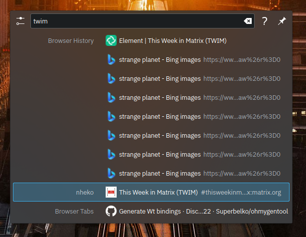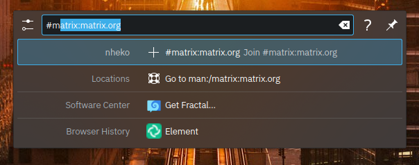 nheko-krunner has finally been released! Version 0.1.0 contains several handy features such as searching your rooms, joining new rooms, and starting and switching to direct chats. Furthermore, if a room has unread notifications, nheko-krunner will let you know by tacking on a notification count to the room name (e.g. This Week in Matrix (TWIM) (1). Currently this feature is not disable-able, but I plan to dive into writing KCMs (KConfig Modules) soon so that I can add a toggle for this.