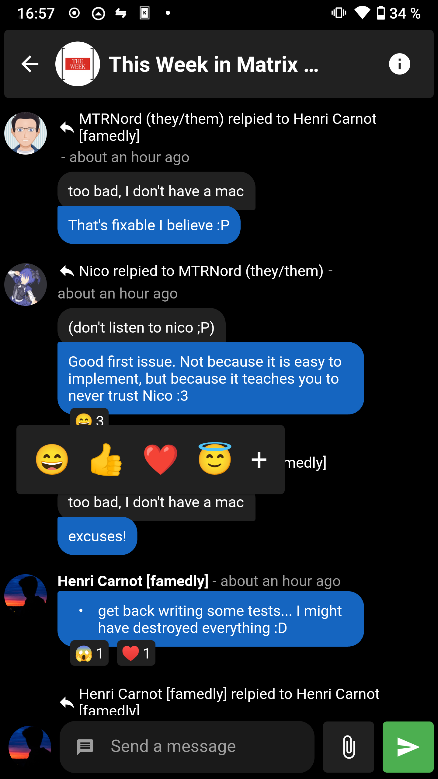 • This week the team discussed how our Web product looks and feels to new users. While we use our own products all the time, it can be good to take a step back and ensure that our product decisions benefit all users, including the newbies. Watch this space for more info in the coming weeks as we continue to trial things that we hope will make onboarding to Element easier.
